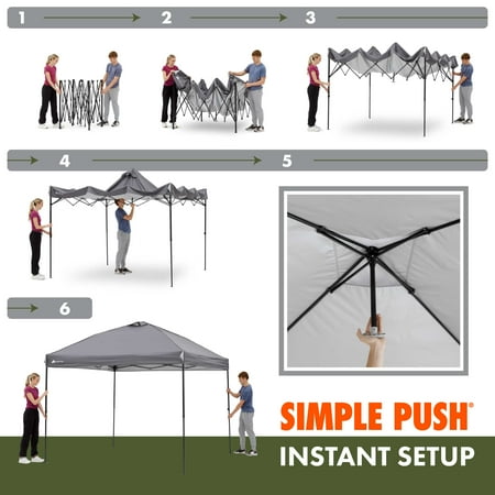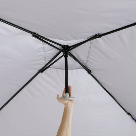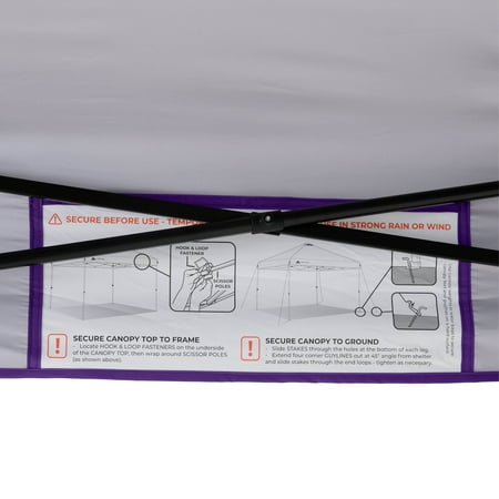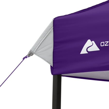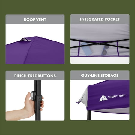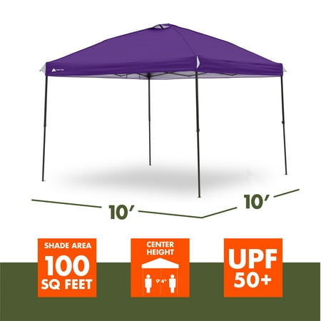 Make your next tailgate, campout, or backyard party more enjoyable with the Ozark Trail 10' x 10' Instant Straight Leg Outdoor Canopy - PURPLE. The instant setup technology allows this canopy to be easily set up in minutes - use the push-button system to extend the canopy so it is ready for use. With 50+ UV protection and the 10' x 10' frame, this Instant Canopy provides 100 square feet of shade to ensure you, your family, and friends are comfortable on hot, sunny days. Versatile feet make setting this canopy up on grass, dirt, or concrete a hassle-free experience. A mesh pocket provides safe storage for small items such as sunglasses, cellphones, and wallets. The built-in roof vent provides increased airflow into the canopy. A center height of 112" allows even the tallest member of the family to be comfortable under the canopy. The Ozark Trail 10' x 10' Instant Straight Leg Canopy is the perfect upgrade for this tailgating season.