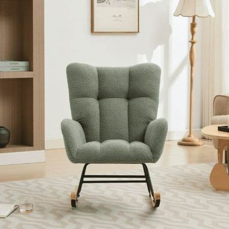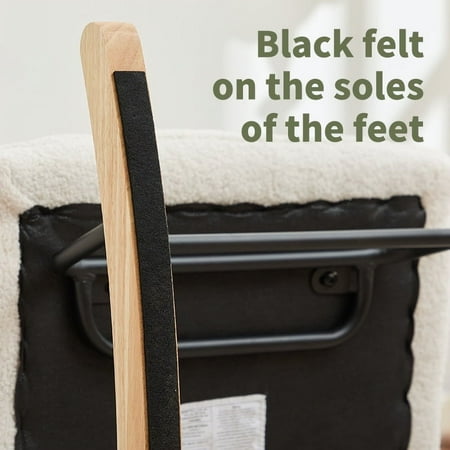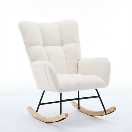 Product Name:Modern Nursery Rocking Chair Upholstered Glider Chair with High Backrest Rocker Accent Armchair with Solid Wood Legs for Nursery Bedroom Living Room Teddy (white) Place of Origin:China Main Color:White Main Material:Teddy Product Dimensions Assembled Length (in.):30.30 Assembled Width (in.):25.20 Assembled Height (in.):35.50 Weight (lbs.):25.30 Package Size Length (in.):25.60 Width (in.):25.60 Height (in.):12.80 Weight (lbs.):28.60 Product Features High-quality Cashmere Material - Upholstered in soft loop teddy material, this tasteful piece can bring you a gentle touch and elegant feel. The fabric is thick and luxurious, and the touch is very delicate. Gentle Rocking Chair - The swing range does not exceed 30°, which is designed based on the concept of the most comfortable rocking rhythm of the human body. Strong Practicality - Ergonomically designed curved backrests and well-placed armrests provide you with great comfort. Not only is it suitable for the elderly to sit in a chair to read newspapers or watch TV, but it is also a great choice for a new mom. Sturdy & Durable Structure - The frame and legs of the chair are made of solid wood and high-quality metal to ensure a safe structure. In addition, there is an extra 2 metal strip between the two legs.