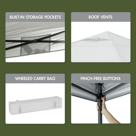 Make your tailgate, campout, or backyard party even more enjoyable with the Ozark Trail 12' x 10' Straight Leg Instant Canopy. It provides a true 120 square feet of shaded relief anywhere in just minutes. Simply extend the one-piece steel frame on this Ozark Trail instant canopy, attach the top, adjust the legs, and you're done. Adjust the shade as needed throughout the day with the easy push-button system. This outdoor instant canopy offers 50+ UV protection, so you're guarded against the sun all day long. The top features dual roof vents and is easily attached with hook and loop fasteners to the frame. For additional circulation, simply open these two included adjustable vents. With the instant setup technology, it's easy to have your Ozark Trail instant canopy up, having fun and grilling burgers in no time. Carry and transportation are made quick and easy with the wheeled carry bag to take it anywhere. Enjoy the outdoors with the Ozark Trail 12' x 10' Straight Leg Instant Canopy.Adventure is where memories are made, whether it's campouts in the backyard with the kids, saturdays at the river with friends, or a week in the wilderness alone. Ozark Trail helps you and your family create everyday adventures with gear and accessories built with you in mind. From backpacks to tents, they're rugged, dependable, and priced to be practical. Because adventure is not a destination; it's a lifestyle.