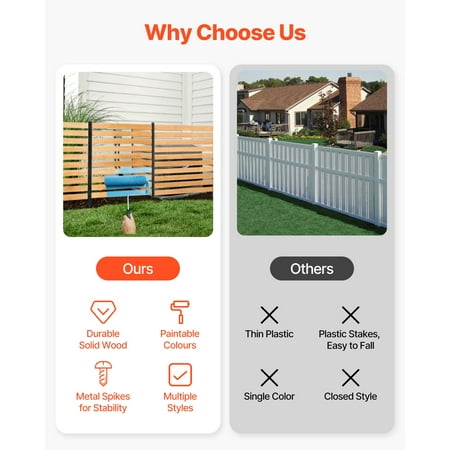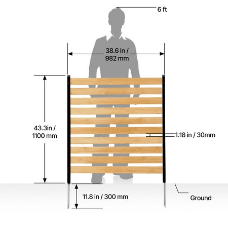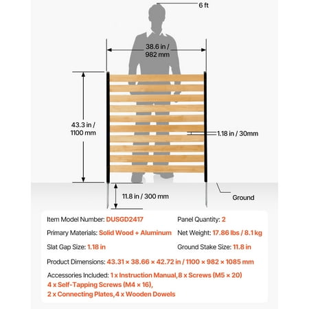 Product Description Outdoor Privacy & Beautification: Wooden Fence Enhance your outdoor space with the KFFKFF Wooden Fence. Made from durable natural solid wood and sturdy metal stakes, this fence is designed to resist deformation and wobbling, ensuring long-lasting performance. Installation is a breeze, requiring no complex tools and can be easily done by one person. Create a personalized layout that suits your preferences, whether it's a U-shape, L-shape, or straight line design. Add privacy and beauty to your outdoor area with the KFFKFF Wooden Fence. Stylish and Practical Wooden Fence Enhance the aesthetics of your outdoor space with this functional wooden fence. Crafted from natural solid wood, it offers an elegant design that effectively conceals unsightly items such as air conditioning units, trash bins, and pool equipment. This fence not only serves as a decorative element but also provides a practical solution for hiding and organizing outdoor essentials. Built to Last in Outdoor Environments Designed for durability, this air conditioner fence is constructed with natural wooden panels and sturdy metal ground stakes. It is built to withstand the elements and is resistant to heat, ensuring it remains stable and intact even in long-term outdoor use. Say goodbye to worries about cracking or deforming, as this fence is engineered to maintain its structural integrity over time. Effortless Installation Setting up this wooden fence is a breeze, requiring no complex tools or professional assistance. With its user-friendly design, it can be easily assembled by a single person in no time. Enjoy the convenience of a hassle-free installation process and have your outdoor space transformed in no time. Customizable and Protective Personalize your wooden fence by painting or customizing it in different colors. This not only adds a touch of style but also serves as a protective measure to extend the lifespan of the wood. By applying paint or protective coatings, you can shield the wood from weathering and ensure its longevity, making it a low-maintenance and cost-effective solution. Flexible and Adaptable Tailor the layout of your fence to suit your specific needs with the versatile configurations it offers. With flexible DIY options, you can easily adapt and expand the fence to accommodate various applications. Whether you prefer a slatted design or a fully enclosed one, this fence provides the flexibility to meet your preferences and requirements. Various Styles to Choose From Select from a range of styles, including slatted or fully enclosed designs, to find the perfect fit for your outdoor space. Each style offers its own unique aesthetic and functionality, allowing you to find the ideal option that complements your surroundings and meets your specific requirements. Specifications Item Model Number: DUSGD2417 Panel Quantity: 2 Primary Materials: Solid Wood + Aluminum Net Weight: 17.86 lbs / 8.1 kg Slat Gap Size: 1.18 in / 30 mm Ground Stake Size: 11.8 in / 300 mm Product Dimensions: 43.31 x 38.66 x 42.72 in / 1100 x 982 x 1085 mm Package Content 1 x Instruction Manual 8 x Screws (M5 x 20) 4 x Self-Tapping Screws (M4 x 16) 2 x Connecting Plates 4 x Wooden Dowels