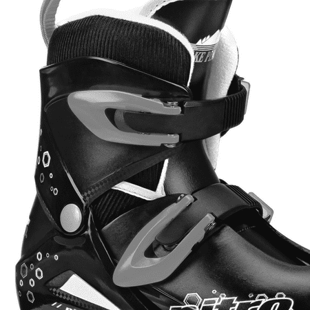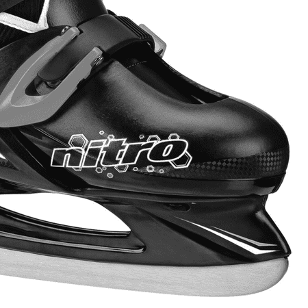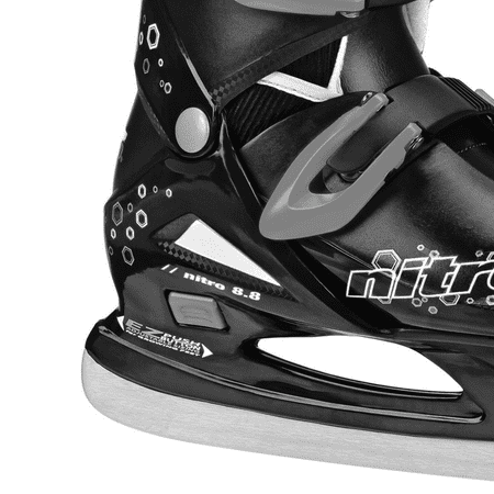 Look cool on the ice in the Lake Placid Nitro 8.8 ice skates for boys. These skates are perfect for beginners. The EZ Push button design allows you to easily adjust the size to fit your child's growing foot for several seasons of wear. Small fits shoe sizes 11J-1, Medium fits shoe sizes 1-4, and Large fits shoe sizes 4-7. Quick-latch buckles are quick to use with no laces to tie. The padded comfort liner is washable. Please sharpen blades prior to first use.