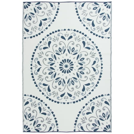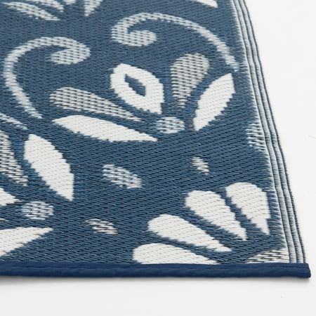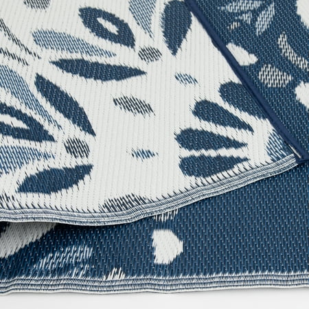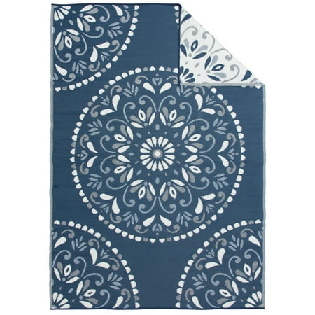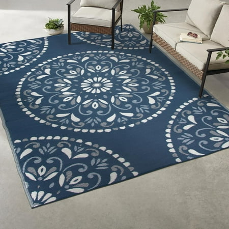 Introducing Mainstays 7'x10' Navy Medallion Plastic Outdoor Area Rug. Add your own unique style to your RV, picnic area, patio, or any outdoor living space with this beautiful reversible woven rug. The elegant medallion pattern on both sides of this eye-catching rug creates an element of depth and lets you bring a touch of modern luxury wherever you go. No risk of fading or staining with this rug! Make the outdoors feel a bit more like home with this versatile, durable piece. Each rug is easy to clean, so you can spend more time enjoying your space and less time worrying about maintenance. Whether you are packing up your camper for an outdoor adventure or enjoying a sunny picnic in your backyard, the stain-resistant and fade-resistant properties of this beautiful area rug ensure that it will maintain its rich design and exceptional quality for years to come. For indoor or outdoor use.