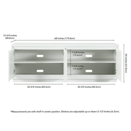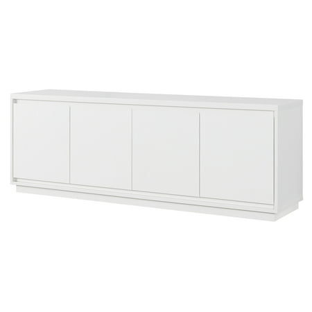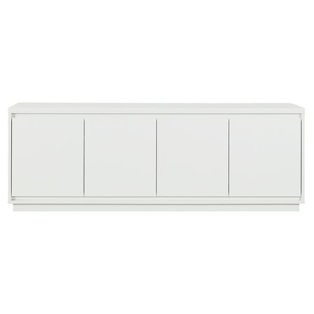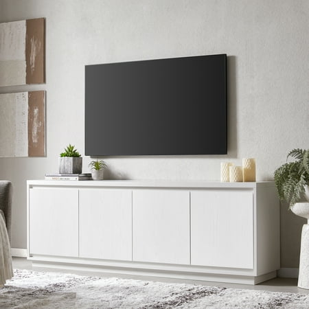 On-trend texture and design combine in this transitional TV stand. With a wood grain finish and textured doors, this piece is sure to be a statement in your living room, den, or game room. The plinth base gives an illusion of a seamless transition from your floor, as if it was always meant to be there. The modern contemporary design of the stand features 4 fully enclosed doors with 4 inner shelves, allowing for ample storage for your devices, games, books, and more.