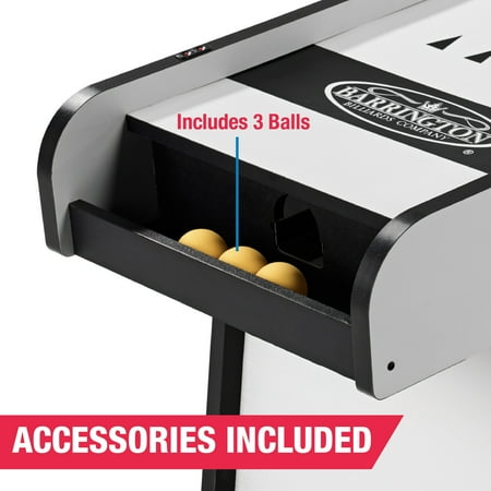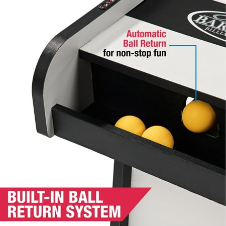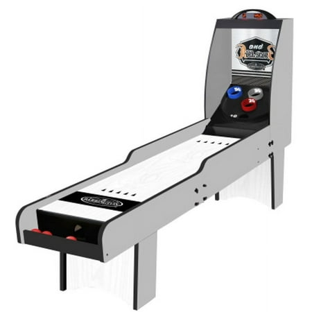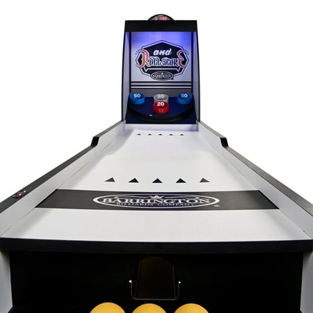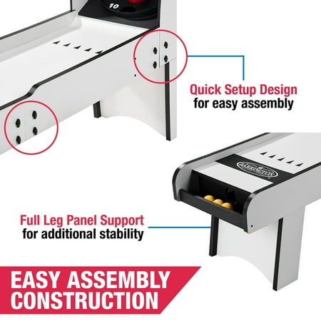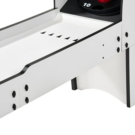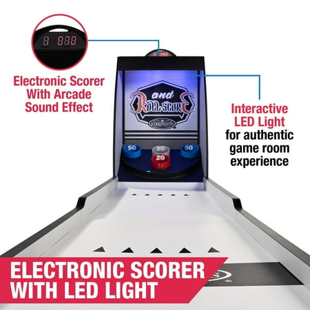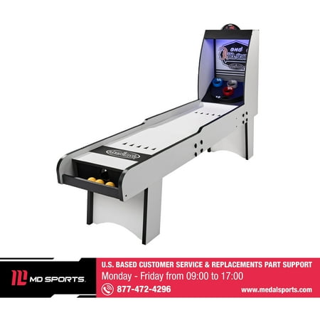 The 7 ft Roll and Score Game with 3 Balls, Arcade Sound Effects and LED Scorer by MD Sports features an automatic ball return for non-stop fun and ABS scoring rings designed to withstand intense play. It includes an electronic scorer with authentic arcade sound effects and is constructed from high-quality engineered wood for long-lasting durability and stability. The scratch-resistant PVC wood-tone laminated finish adds a sleek look, while full leg panel support provides additional stability. The 2-piece table construction ensures quick setup and easy assembly, and built-in LED lights illuminate targets in the dark for added excitement. The table requires 3 AAA batteries (not included) and includes 3 arcade balls. Please note that it’s not suitable for children under 3 years, and adult supervision is required for children playing. Assembled dimensions are 84" L x 20" W x 52" H, with a product weight of 70.40 lbs.