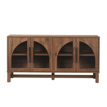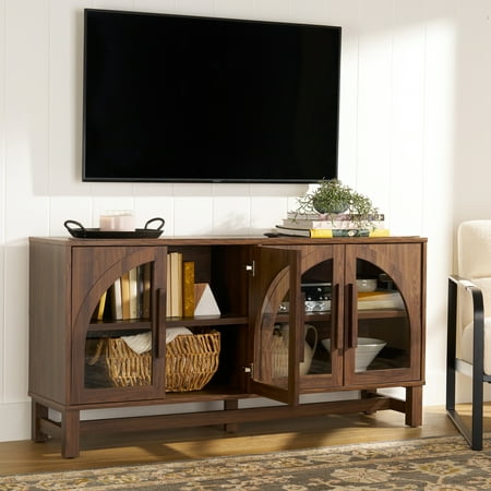 Add a modern touch to your entertainment center with the Better Homes & Gardens Juliet Arc TV Stand in a rich walnut finish. With its arched and tempered glass doors, this TV stand exudes elegance. It features two adjustable shelves, providing ample storage for your media equipment, decor items and memories. Plus, this TV console perfectly blends style and function with built-in wire management holes and dimensions that make it ideal for accommodating flat panel TVs up to 65". Embrace sophistication and versatility with the Juliet Arc TV Stand, also available in a light honey or black finish, and coordinate effortlessly with your existing furniture.