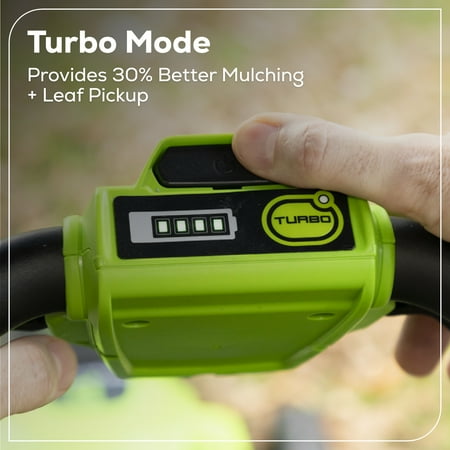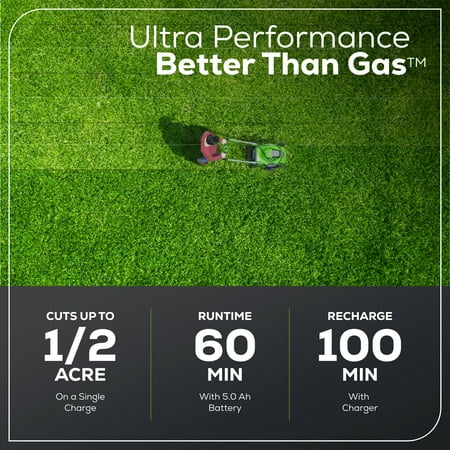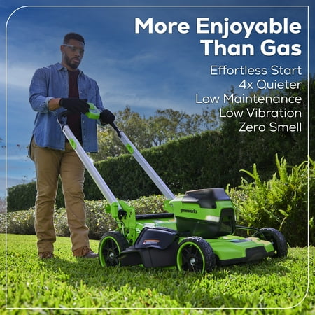 Replace dangerous emissions, smells, hassles, and maintenance with Greenworks 60V 21" Battery Powered Push Lawn Mower. The intelligent brushless motor technology provides constant, fade-free power equivalent to 150cc gas powered lawn mowers. Lawn mower mows up to 0.5 acres on a single charge, and battery fully recharges in just 100 minutes. The heavy-duty steel cutting deck with eight-position, single-lever cutting height adjustment provides maximum airflow for excellent cuts, and features our four-in-one design for mulching, side discharge, or bagging, with added turbo button for better lift when picking up leaves. With hassle-free, push button start, you'll get to work fast, with no priming, no choke, and no pull cord. Other features include LED headlights, oversized 10" rear and 8" front tires, and EZ Fold handles for space-saving vertical storage. Includes 5.0 Ah lithium-ion battery NS charger. Battery is compatible with 75+ Greenworks Pro 60V products.