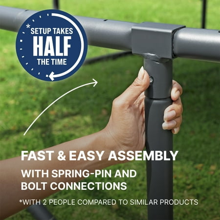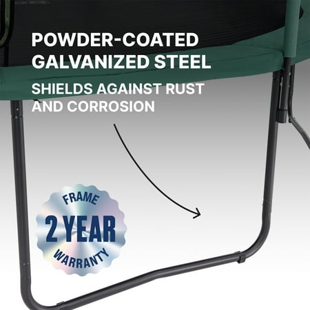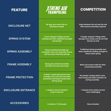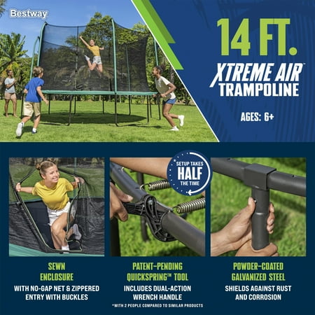 Give your kid hours of laughter and fun from the comfort of your own backyard with the long-lasting and durable Bestway® Xtreme Air™ 14 ft. Trampoline. Perfect for kids ages 6 and up, the large trampoline includes a no-gap, sewn enclosure net with a zippered and buckled entry, and foam-padded enclosure poles, making it as secure as it is fun. All-in-One Setup: The Xtreme Air trampoline has all you need for a complete trampoline, including an easy assembly kit that includes Bestway’s patent-pending QuickSpring™ trampoline tool for hassle-free spring installation with a dual action wrench handle, plus spring-pin and bolt connections on most pieces for simple setup. Made to Last: Built from powder-coated galvanized steel to shield the trampoline's frame from rust and corrosion, the Xtreme Air trampoline is durable and ready to handle the outdoor elements season after season. Featuring weather-resistant foam pads, spring pad and an L-shaped enclosure net with buckles, you and your family will enjoy making memories together around the trampoline. Give your kids the ultimate way to get their energy out and have even more fun every day with the Bestway Xtreme Air 14 ft. Trampoline!
