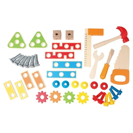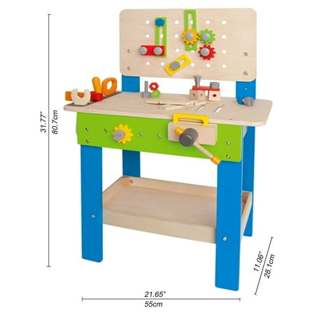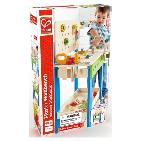 HAPE MASTER WORKBENCH - 35 PIECES - Little builders with big ideas can work right at this professional-looking station. Shelves and storage keep all their tools and supplies within easy reach. Mini mechanics can use their imagination as they role-play different jobs and act out scenarios, like building or fixing things. When children use the tools, maneuver the pieces, and engage in building activities, they’ll improve their dexterity and fine-tune finger movements. As junior builders get bigger, the height of the workbench’s legs can be adjusted to accommodate your child as they grow. This workbench and its accessories are made with wood from FSC-managed forests, and the included shelves allow for easy storage of tools and parts. Product height 31.77 Inches and Product Weight 11 lbs.