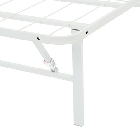 Make the most out of your mattress with the innovative and durable design of Mainstays 14-Inch High Profile Foldable Steel Platform Bed Frame. It's constructed of powder-coated heavy-duty steel, that uniquely uses a reliable mesh platform that allows you to place your mattress directly onto the frame without a box spring. This adult bed frame is quick and easy to assemble with no tools required. It features a button locking system on legs that keeps the bed fully sturdy and easily folds in half for transport and storage. The high-profile bed frame creates a storage opportunity under your bed and stands on capped feet to minimize damage to floors. You and your family are sure to appreciate the durable, sturdy design of this Mainstays 14-Inch High Profile Foldable Steel Platform Bed Frame. Assembled weight: 49.05 lb.