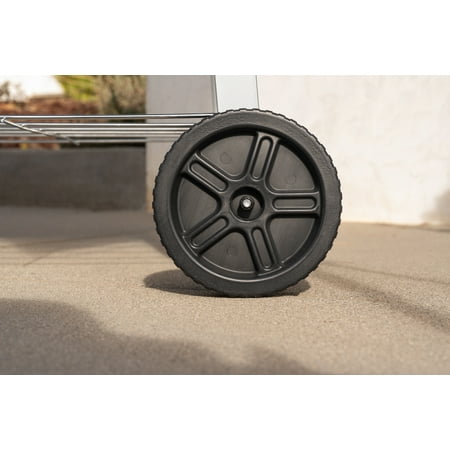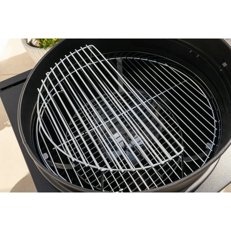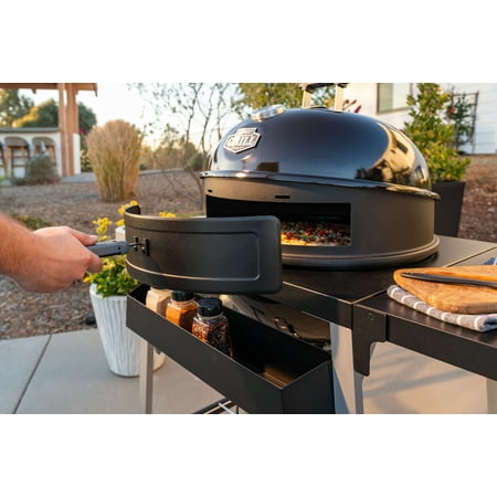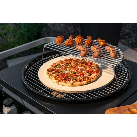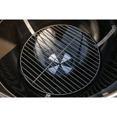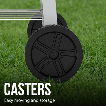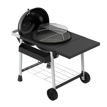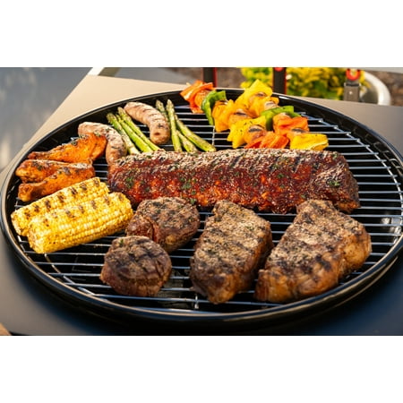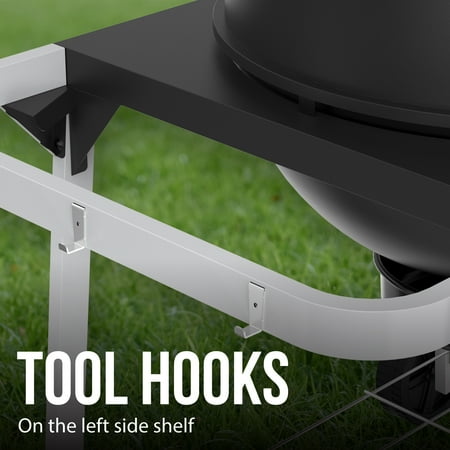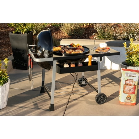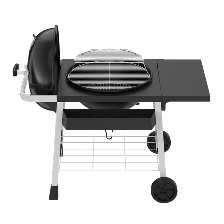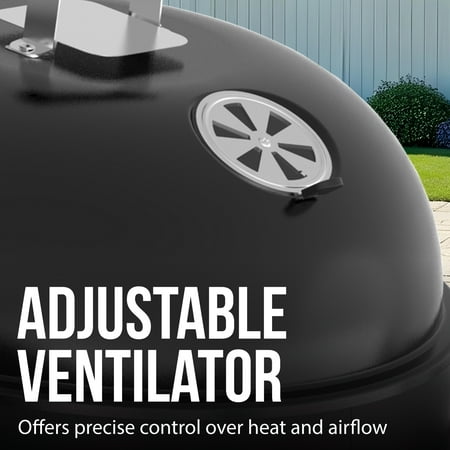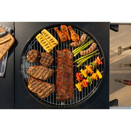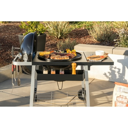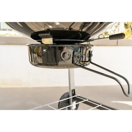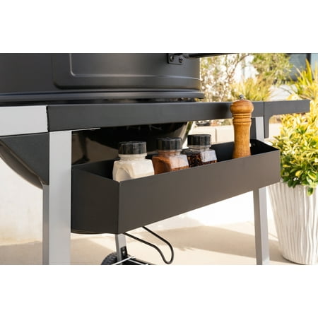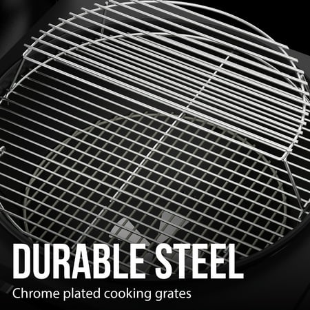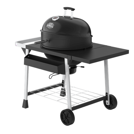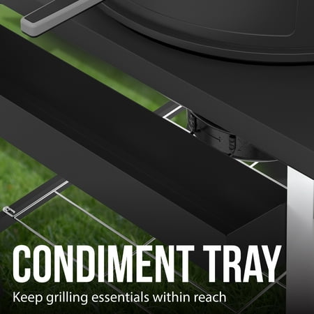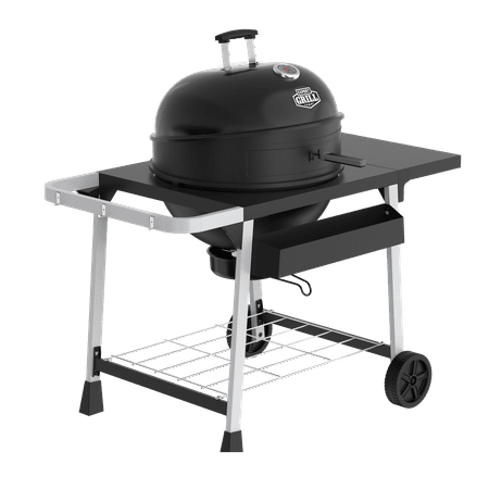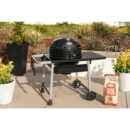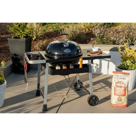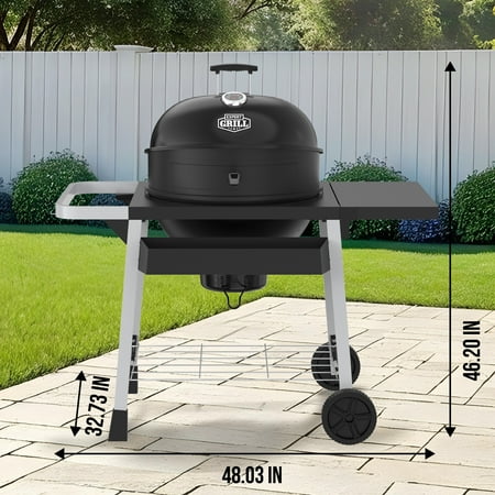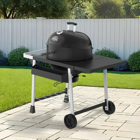 Elevate your grilling with the Expert Grill 22.5” Kettle Charcoal Grill Cart – a backyard powerhouse that turns cookouts into unforgettable feasts. With 489 square inches of cooking space, you can grill up to 17 burgers at once, perfect for family gatherings, BBQ parties, and weekend celebrations. This grill does more than just barbecue. With a 16” pizza stone and rotary cooking grid, it transforms into a charcoal-fired pizza oven, delivering perfectly crispy pizzas right at home. The warming rack keeps your food hot and ready to serve. An adjustable ventilator gives you precise control over heat and airflow, whether slow-smoking or searing. The built-in temperature gauge ensures perfect results without lifting the lid, and the lid bracket lets you hang the lid on the side, keeping your hands free. Convenient features include a removable ash catcher for easy clean-up and heat-safe handles for protection. Storage space is plentiful with a right side-shelf, front condiment tray, and bottom rack so all your grilling essentials are close at hand. The side handle with accessory hooks keeps your tools organized and ready for action. When it’s time to move, two heavy-duty wheels and a sturdy side handle make it easy to roll your grill into place. Built with durable steel and chrome-plated grates, this grill is designed for long-lasting performance. Whether grilling, smoking, or baking pizzas, the Expert Grill Kettle Charcoal Grill Cart brings the heat – and so much more!
