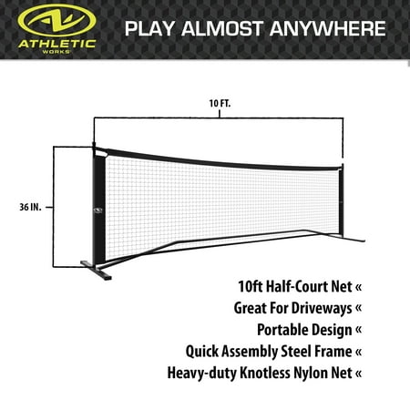 Introducing the Athletic Works 10ft Half-Court Portable Pickleball Net, available exclusively at Walmart. Interlocking steel frame for quick and easy assembly. Includes carry bag for convenient storage on the go. Designed to elevate your pickleball experience with convenience and reliability, this portable net is perfect for setting up a half-court anywhere you play. Whether you're practicing solo or enjoying a friendly match with friends and family, this portable net offers convenience and durability. Perfect for recreational play or training sessions, it enhances your pickleball experience wherever you play. Take your pickleball game to the next level with the Athletic Works 10ft Half-Court Portable Pickleball Net. Set up your court in minutes and enjoy endless hours of fun and competitive play.
