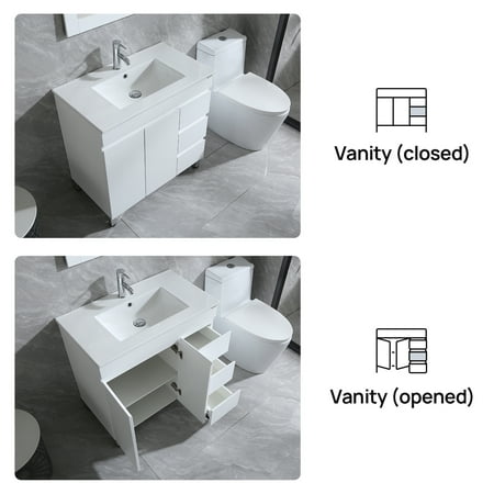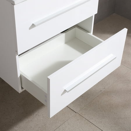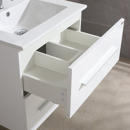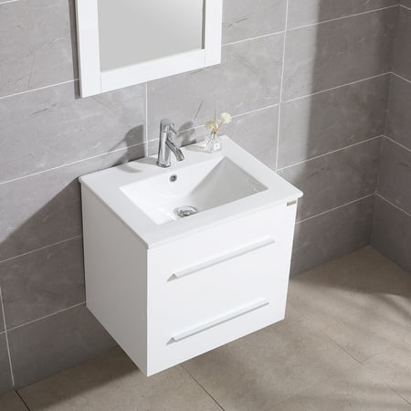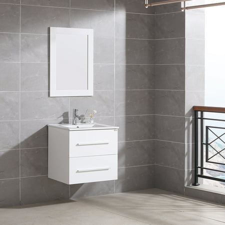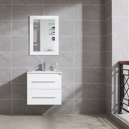 Description: This Wonline versatile vanity family is available with distinctive vessel sinks or sleek integrated counter and sinks to fulfill your design dreams. 1.The bathroom vanity set made by highly water-resistant MDF, which is humidity & corrosion, easy to clean, wear-resistant, environmental protection, and with long using time. 2.Unique and striking contemporary design, and with fully-extending soft-close drawer, provides a complement of storage areas. A wall-mounted vanity will save much space, perfect for small bathrooms and powder rooms. 3.This 24" bathroom vanity with sink set includes a 21.7"W x 29.5"H mirror.4.Simple assembly required. Single-hole faucet mount. Come with drain assemblies and P-traps for easy assembly. Specification: -Cabinet Dimensions:23.6’’L*17.7’’W*21.65'’H -Oval ceramic vanity sink:24.1’’L*18.1’’W*6.7'’H -Mirror Dimensions:21.65’’*29.5’’ -Gross Weight:103.6lbs Package Include: -1 x Mirror -1 x Ceramic Oval Sink -1 x Cabinet with two drawer -1 x Copper Basin Faucet -1 x Zinc alloy water machine -1 x Copper Pop-Up Drain -Plastic hanging code -Installation Kit