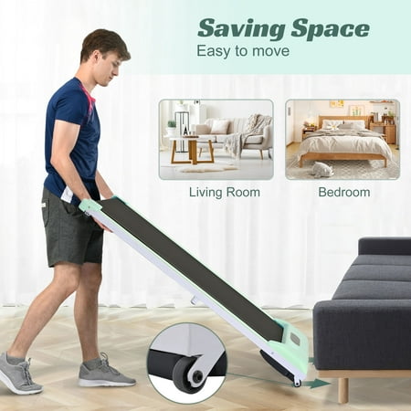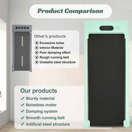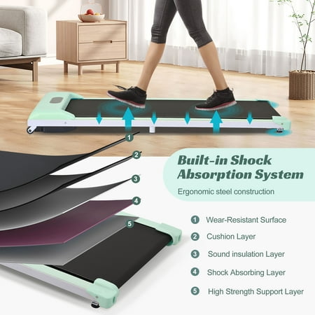 【2 in 1 Under Desk Treadmill】The independent remote control can efficiently control and adjust the running speed and improve the running safety. Available in 0.5 to 4 MPH Speed levels, this walking treadmill allow you to select different speed base on your physical condition and exercise based. 【Quiet and Powerful Motor】With a 3 HP powerful quiet Motor,the electric treadmill is perfect for running, jogging, and walking in the comfort of your home. With a durable steel frame and multi-layer shield design, the under desk treadmill's shock-absorbing and noise-reducing, making your running quieter, safer and more comfortable. 【Bluetooth Connection and LED Display】 The LED display clearly shows time, calories, step, speed and distance, monitoring your progress in real time and keeping your movement data at a glance. Connect the treadmill to your phone through Bluetooth, so you can play music while you are exercising. 【Non-assembly Design & Space Save Design】 This 2 in 1 treadmill arrives fully assembled and can be used directly after unboxing. Foldable design and transportation wheels allow for easy mobility and portable foldable treadmill for storage, fold it up and walk away in one easy step, perfect for home , apartment, office use. 【More Freely】39.37"x 14.96" Widened Running Belt Making running or walking on this treadmill more freely. 5 layers non-slip running belt and Silica gel column support will greatly absorb shock to provide cushioning for knee, muscle and joints.