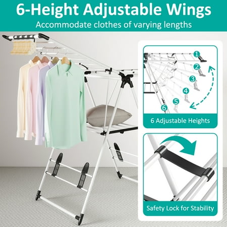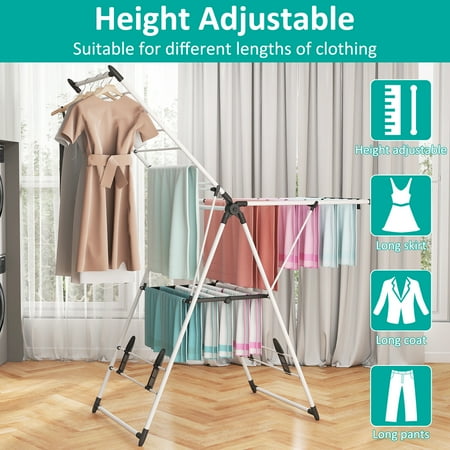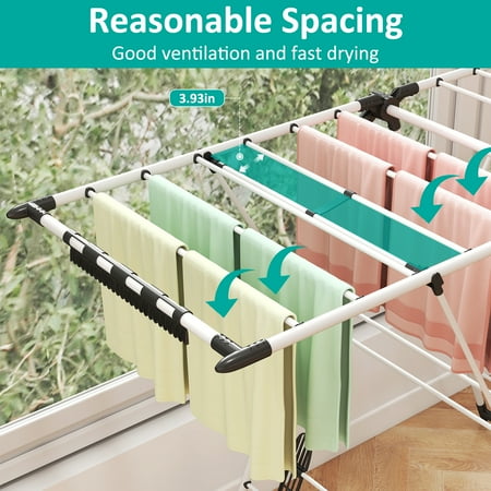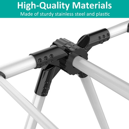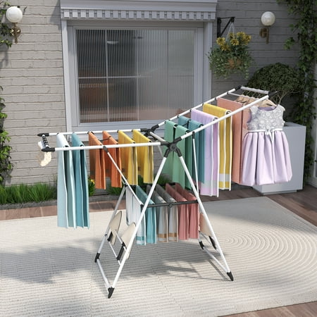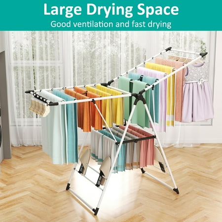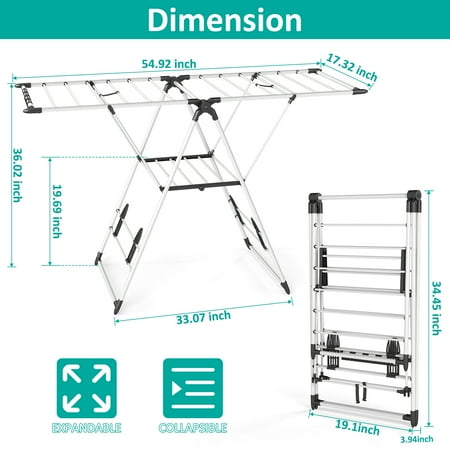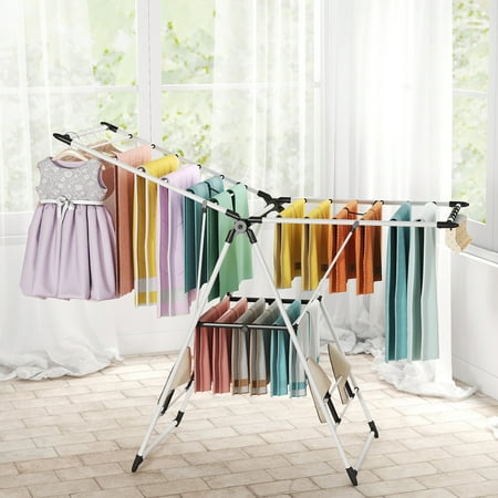About this item VERSATILE DRYING RACK – Equipped with racks that you can drape pants, hang shirts, and lay towels, this drying rack is the perfect piece to add to your laundry room. FOLDABLE – This clothing drying rack can easily fold up and be stored compactly between uses. INDOOR OUTDOOR USE – The metal rack can be utilized outside in the sunshine for a wrinkle free dry, or indoors as an alternative to a clothing line when the weather is cold or damp. DURABLE – The stainless-steel frame and plastic rotator joints help the laundry rack be able to hold all types of linens or clothing while not buckling under the pressure. PRODUCT DETAILS – Dimensions: (L)60” x (W)23.3” x (H)42”; Material: stainless-steel and plastic.