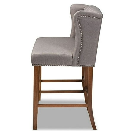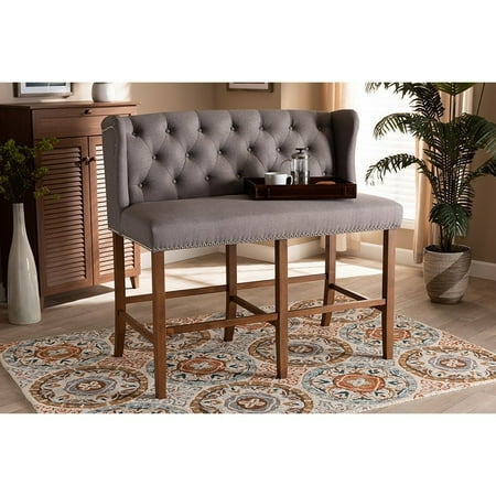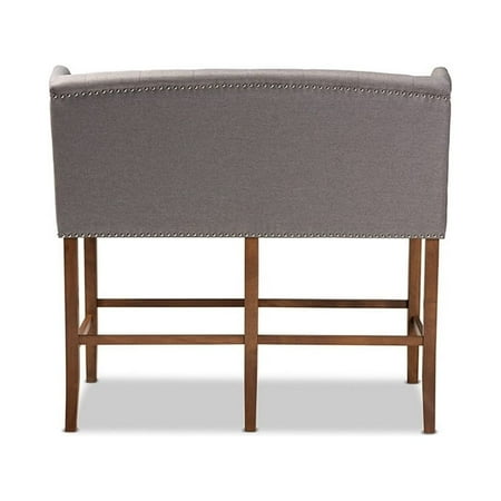 Contemporary Grey Fabric Upholstered Walnut Finished Wood Button Tufted Bar Stool Bench Host happy hour in your home with the Alira bar stool bench. Constructed from wood, this bench provides solid seating for two. The seat and back are upholstered in a soft neutral fabric and padded with foam for endless comfort. A built-in foot rest provides additional seating comfort. Elaborate button tufting on the back gives this bench a refined look, while silver nail heads highlight the elegant wingback silhouette. The Alira is well suited for both a kitchen or bar setting. The Alira bar stool bench is made in Malaysia and requires assembly. Specifications: Constructed from rubberwood, MDF wood, and LVL Walnut finish Upholstered in polyester fabric and padded with foam Button tufted Silver nail head trim Assembly required Made in Malaysia