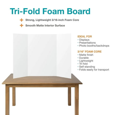 Create eye catching projects using the Pen+Gear White Tri-Fold Foam Board. This lightweight foam board works well for presentations, signs, and mounting. It's 3/16 inches thick and the foam surface works well with glue, paint and markers while cutting easily. Make the most of your presentation by using this large foam board that's easy to carry from home to school or the office. The 3/16-inch polystyrene core adds durability for multiple uses or rough handling at a school science fair. Create a magnificent project with this Pen+Gear White Tri-Fold Foam Board.