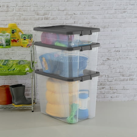 Sterilite’s 40 Quart Modular Stacker Bin with lid brings a whole new level of organization to garages, basements, and attics! The durable storage container is built for challenging environments, and the clear plastic bin lets you quickly view and locate stored contents. Robust, rugged latches keep the bin with lid secure during transport and stacking, while the textured surface ensures a comfortable grip. Deep recessed lids provide stability for stacking to make efficient use of vertical storage space. This size is perfect for storing linens, towels, and other household supplies, and fits neatly under the bed to take advantage of unused storage space, delivering durable, modular storage you can count on. The overall assembled dimensions of this item are 25 3/4" L x 18 3/8" W x 7 1/4" H.