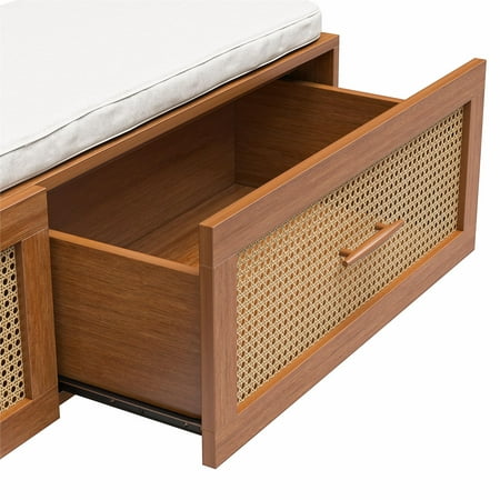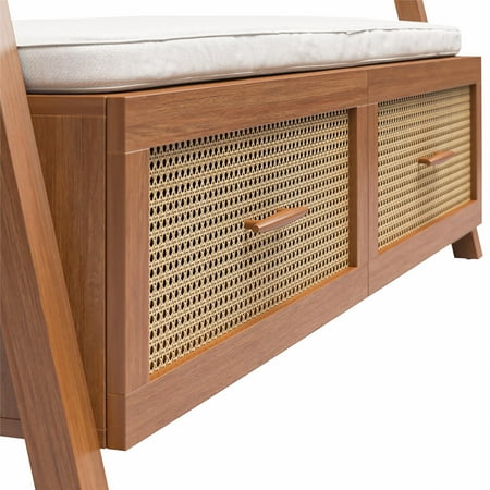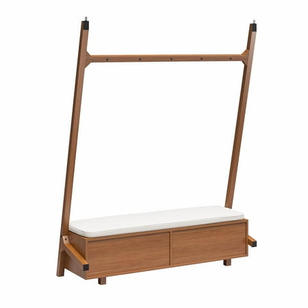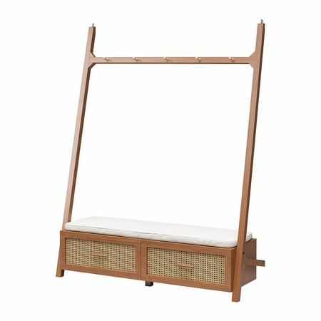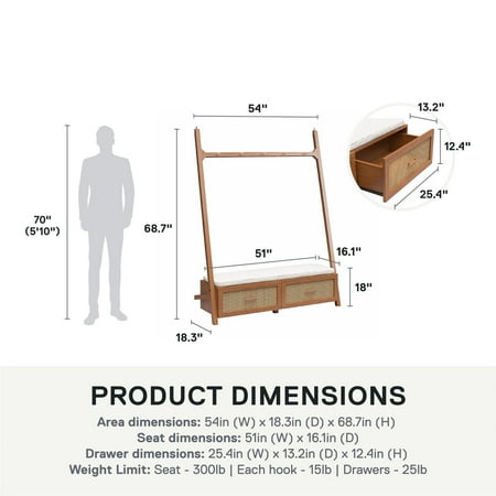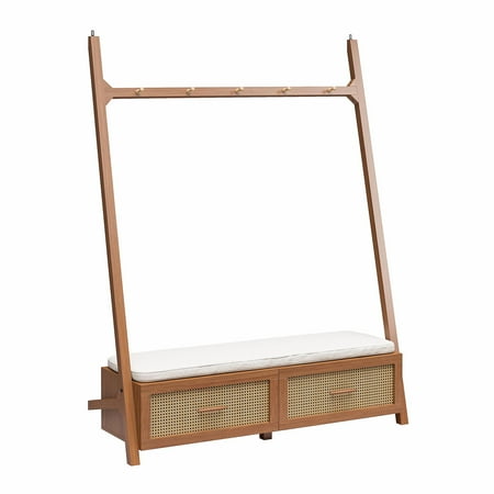 Streamline your entryway with the Better Homes & Gardens Springwood Entryway Tree. Crafted from laminated particleboard, this bench exudes a trendy vibe with its charming woodgrain finish and rattan drawer fronts. Utilize the five chunky wood knobs for hanging coats, scarves, and bags, while the two deep drawers effortlessly organize shoes and accessories. The contemporary leaning ladder design, coupled with minimalistic decor features and an open back, enhances the overall aesthetic. Take a seat on the padded bench while slipping on your shoes. For added stability, the entryway hall tree includes a wall anchoring kit. Delivered flat to your door, assembly is required upon arrival, and we recommend the hands of two adults for the task. Assembled dimensions: 68.7"H x 54"W x 18.34"D.