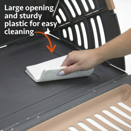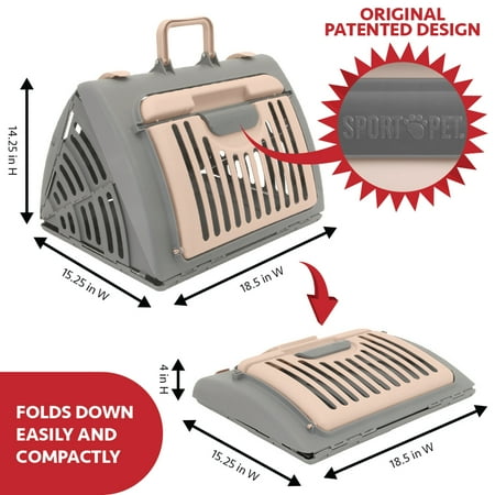 Finally a cat carrier that is designed specifically for cats. The sport pet travel master cat carrier is the last cat carrier you will ever need. The key feature is the carrier’s door with a wide side-opening gate that cats feel comfortable walking into. The carrier’s gate can be smoothly shut, quickly and safely keeping you and your pet safe and happy. Numerous veterinarians and reviewers have commented about the door design making life easier. “Working with a cat has become so much easier”, we often hear. Less stress on the cat. Easy transport for the cat owner. Easy handling for the veterinarians. The quality of the tooling is outstanding. The body of the cat carrier is made out of an impact resistant polypropylene. The latch and door are high strength premium polycarbonate. The cat carrier easily folds down for storage. This handy portable crate can be stored nearly anywhere, closet, car, fits easily in a cabinet. A standard dog kennel or carrier takes up too much space. Our cat carrier is the best pet porter on that we have seen in the market. The cat carrier also has plenty of ventilation. The ventilation slats are designed to have smooth rounded edges and are wide enough for your pet to have enough visibility to stay calm and safe. Our cat carrier is sturdy. Convenience did not come at a cost to quality or durability. Works great for large cats.