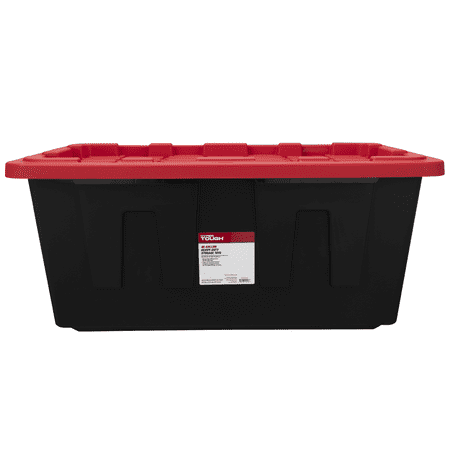 Organize clutter and hide unused items with the Hyper Tough 40 gallon snap-lid plastic storage tote. Made of durable polypropylene, the black storage tote allows you to hide away things you don’t want to be seen while the red snap-lid adds a pop of color to your space. The 2-point snap-lid ensures your items are safely secure during storage or transport. The specially molded lid allow you to stack multiple totes on top to prevent toppling and maximize storage space. Protect your valuables by utilizing the 6 tie-down holes made for zip-ties and padlocks. The long lasting Hyper Tough tote works great in basements, closets, pantries, sheds, barns, and attics. This tote is great for organizing household products, gardening supplies, pet treats and supplies, shoes, clothing, seasonal gear like boots, sporting equipment such as golf balls, tennis balls, or drill cones, and many other items. Also available in multiple sizes in clear and red (15 Gallon and 27 Gallon) or in black and red (5 Gallon, 12 Gallon, 17 Gallon, 27 Gallon, 40 Gallon, 50 Gallon).