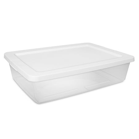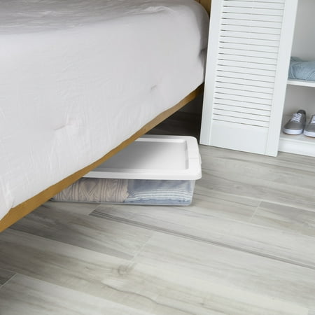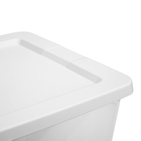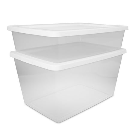 Organization is made easy with Sterilite's Set of (2) 28 Quart Storage Boxes! The convenient pack includes two of the popular 28 Quart size storage bins with lids. The clear base lets you see contents at a glance, while the snap-on lid keeps items contained. The space-efficient shape and deep recessed lids allow bins to stack securely, maximizing vertical storage space. Sort and store a variety of household items to bring order to closets and bedrooms! This size plastic storage container is ideal for storing towels, clothing, linens and more, and fits neatly underneath the bed for out of sight storage. Note: Use good judgment when storing items, don’t overload, keep heaviest bin at bottom, and don’t stack too high.