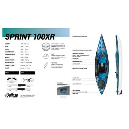 With its deep V-chine hull design, the Sprint 100XR performance kayak is made for more advanced paddlers looking for better secondary stability to withstand choppier conditions. Providing more responsiveness to weight and position shifts for a better return on effort, this recreational performance kayak also comes with a paddle and a little extra load capacity. Convenient features such as the 10 cm day hatch and bottle holder in the cockpit table ensure your gear is within reach, and you can safely stow away the rest of your possessions in the rear quick-lock hatch. The Sprint 100XR is undoubtedly the ideal sit-in kayak for those looking to take their kayaking to the next level.