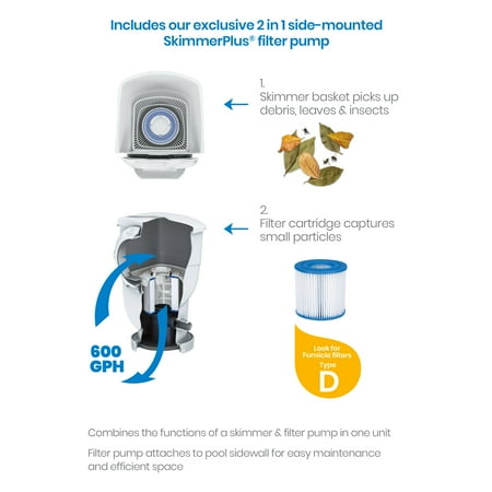 The Funsicle 14ft Activity Pool includes all the essentials for outdoor play and swim. It's durable and easy-to-assemble with a SmartConnect snap-in frame. This above ground pool comes with an efficient SFX600 filtration system with a built-in 2-in-1 skimmer that conveniently attaches to the pool wall and keeps the water clean and sparkling. With space for up to 7 people to enjoy interactive games and swimming, the Funsicle Activity Pool is best for families, party hosts and outdoor enthusiasts who enjoy being active in a high-value pool. Just snap the poles together to build, then fill it water and chill in your refreshing swimming pool.