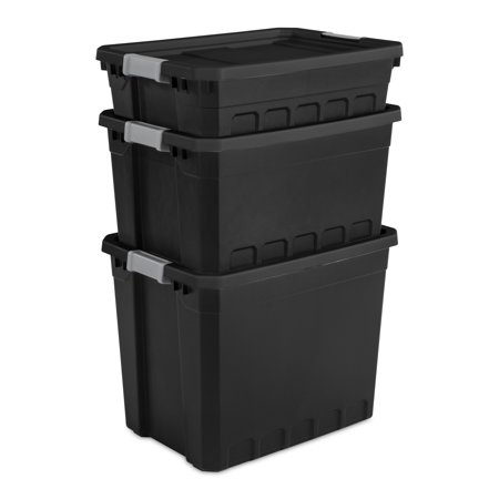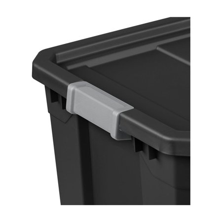 Sterilite’s 19 Gallon Modular Stacker Bin with lid brings a whole new level of organization to garages, basements, and attics! The durable storage container is built for challenging environments, and the opaque plastic bin conceals contents for out-of-sight storage. Robust, rugged latches keep the bin with lid secure during transport and stacking, while the textured surface ensures a comfortable grip. Deep recessed lids provide stability for stacking to make efficient use of vertical storage space. This size is perfect for storing bedding, seasonal clothing, sports gear, and camping supplies, delivering durable, modular storage you can count on. The overall assembled dimensions of this item are 25 3/4" L x 18 3/8" W x 13 1/4" H.