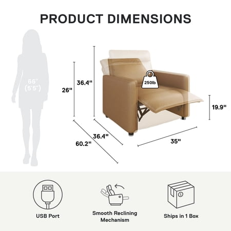 Relax in style and comfort with the Mainstays Williamson Upholstered Power Recliner, the perfect addition to your living room, bedroom, or entertainment space. Designed with everyday comfort in mind, this oversized recliner is upholstered in rich brown faux leather and features plush foam cushions, pocket coil seating, and a no-sag spring base for long-lasting support. With the touch of a button, you can easily recline and kick up your feet, while the built-in USB port lets you charge your phone or tablet without getting up. The sleek, space-saving design fits well in smaller rooms, and the modern look blends easily with any home décor. The power control button is tucked on the inside panel of the armrest to keep the chair looking clean and simple. Best of all, it ships in one box and sets up in minutes with no tools needed. Whether you're watching TV, reading, or just relaxing, the accent chair makes it easy to get comfortable. Recliner dimensions: (Sitting) – 36.4"L x 35"W x 36.4"H. (Reclining) – 60.2"L x 35"W x 26"H.