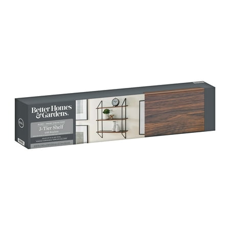 Display your favorite frames and decorative accents with the Better Homes & Gardens 20" 3 Tier Shelf with Brackets. This Better Homes & Gardens 3 Tier Shelf features a walnut woodgrain finish on the three shelves and matte black brackets that works in just about any type of room decor. It's a perfect addition to your entryway, family room, or bedroom. Included are 3 walnut finish shelves and 2 black metal brackets. Comes ready to assemble with instructions and all hardware to attach the shelves to the brackets and hang on the wall. When fully assembled this Better Homes & Gardens 3 Tier Shelf measures 20 in. L x 5 in. W x 23 in. H. Constructed out of durable medium-density fiberboard and metal, the 3 Tier shelf can support up to 10 pounds.