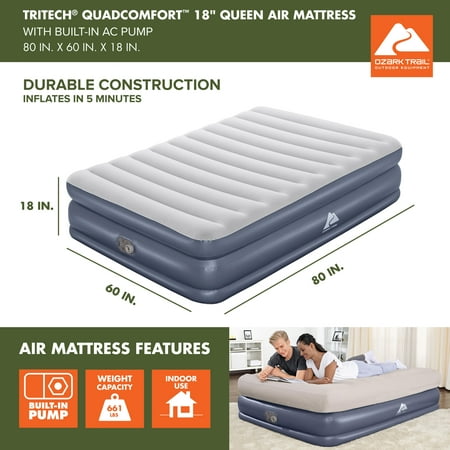 Wake up renewed and refreshed on the Ozark Trail® Tritech® QuadComfort™ Air Mattress, featuring a fitted sheet-friendly design and convenient built-in pump. The internal structure, constructed with premium, durable Tritech material, increases stretch-resistance and allows the mattress to keep the same shape no matter how many times it's inflated and deflated. Specifically engineered for firmness, this material minimizes air loss throughout the night. The bed features a top layer that is the same height as a traditional mattress, allowing you to use your favorite sheets without them slipping off. The built-in pump inflates the mattress in 5 minutes, so it is ready for bed when you are. In the morning, simply deflate and place your flattened bed in the included carry bag for easy transport and storage.