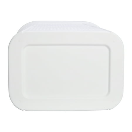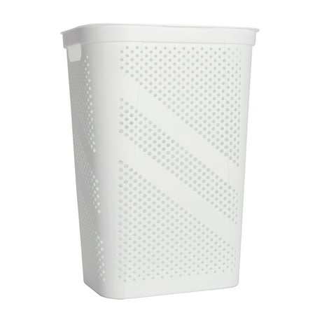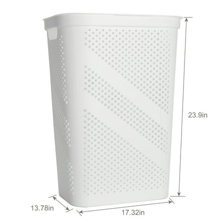 Keep your space tidy and organized with the Mainstays Hinged-Lid Laundry Hamper. Designed with functionality in mind, this hamper features a durable hinged lid to keep laundry neatly contained, while hexagon-shaped ventilation holes provide optimal airflow—ideal for damp towels or clothes. Its compact footprint makes it a great fit for most rooms, and the built-in side handles offer easy transport from room to room. Suitable for all ages and perfect for any home, this versatile hamper combines style and convenience. Product Dimensions: 17.32" W x 13.78" D x 23.9" H. Available now in white, in-store or online at Walmart.com.