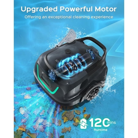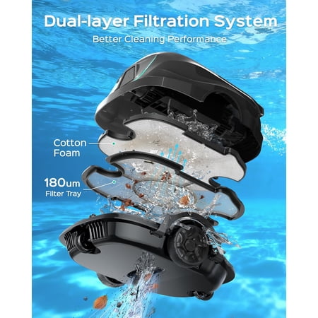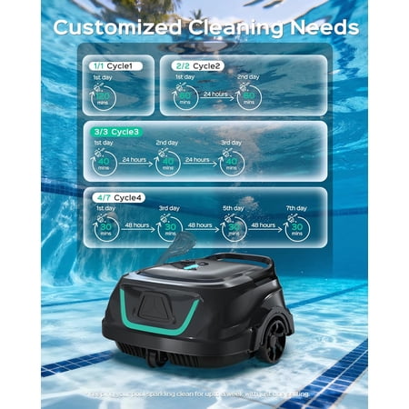The WYBOT Cordless Robotic Pool Cleaner delivers powerful, hands-free cleaning with an upgraded dual-motor system providing 2140 GPH suction. Its exceptional dual-layer filtration (180μm + foam) captures fine debris and sand with 50% greater efficiency. Enjoy up to 120 minutes of runtime across 1076 sq.ft, with four selectable cleaning cycles for up to seven days of automated maintenance. The cordless design self-parks when battery is low and recharges in just 2.5 hours. Five LED indicator colors keep you informed of status—green for battery, blue for working, yellow for low power, purple for cycle mode, and red for errors. Ideal for above-ground pools seeking effortless crystal-clear results.