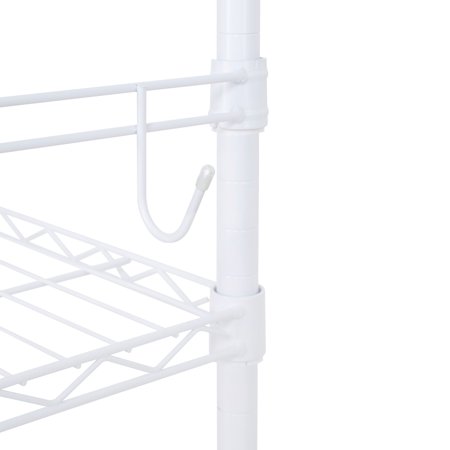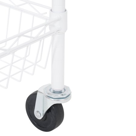 Hyper Tough 3 Tier New Multi-Purpose Rolling Cart in White is an easy assembly item with no tools required. It offers you versatile storage solutions for your kitchen, laundry room, garage, office etc. Its wire shelves and basket are adjustable in 1 inch increments. Four durable casters allow you to wheel the cart from one room to another with ease. .The total load capacity on casters is up to 495 lbs per unit when evenly distributed. NSF certified for dry storage. Perfect storage unit with flexible mobility.
