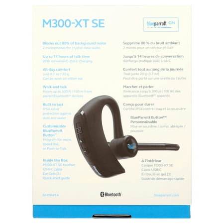 The BlueParrott M300-XT SE Bluetooth driving earpiece headset is designed for superior calls in high-noise environments. Featuring 80% noise cancellation with 2-mic tech, our earpiece for drivers provides 14 hours of talk time on a single charge for those who work long shifts. Our ultra lightweight earpiece weighs just 0.7 oz., making it an excellent option for those who work on the road delivering packages, food delivery drivers, taxi drivers, ride-share drivers, limo drivers, and anyone who drives for a living. In addition, our driving headset earpiece is reversible so that you can wear it on whichever side you prefer. With a wireless range of 300 feet (100 meters), our blue tooth headset for work ensures you can leave your phone in your vehicle as you're dropping off orders, ideal for local truckers, remote workers, or anyone on-the-go. Our hands-free call earpiece with mic provides IP54-rated protection against dust and water, making it a rugged and comfortable accessory for your work mobile phone. And while you're on the road, you can instantly mute calls, speed dial a preferred contact, or Push-to-Talk with your colleague using our customizable BlueParrott Button. Simply program it with your most-used function for instant access without taking your eyes off the road. The wireless earpiece pairs with up to 8 devices, with 2 simultaneous connections, and provides 420 hours of standby time.