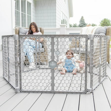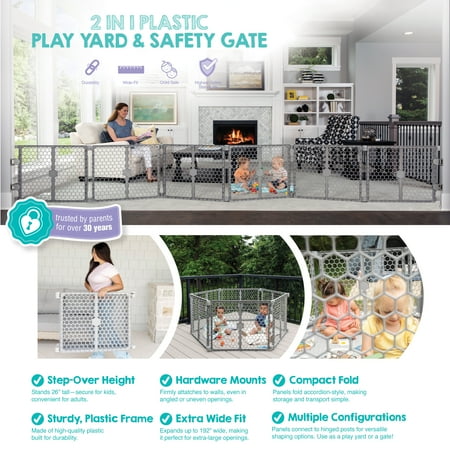 Providing a versatile way to keep your child safe, the Regalo 2-in-1 Play Yard and Safety Gate offers you numerous gate or play yard configurations to protect your child. Made of high quality plastic, the 6-panel gate expands up to 192” wide and is designed with plastic hinged posts to offer a variety of shaping possibilities. It is deal for large and angled openings or as a play yard for your child. The 6-Panel Plastic Baby Gate is equipped with an attachable wall-mounting system allowing you to create a super wide baby gate. When not being used as a gate, secure the panels into a play yard by attaching and securing the hinged posts.
