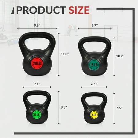 Training with kettlebells allows you to select resistance training exercises based on their similarity to actual movements that occurs during sports. kettlebells require more balance than training with barbells or machines, and balance is crucial for optimal performance. kettlebells also require more muscular control than barbells, thus enhancing kinesthetic awareness. The best part of training with kettlebells is it allows the athlete to train through a greater range of motion than barbells on some exercises. Understand that it is sometimes more valuable to trade heavy weights (Barbells) for more sport-specific movements. Kettlebell exercises demand the use of multiple joints, which engage all the larger muscles of the body. Compound kettlebell moves burn calories faster than isolation moves, which only work one muscle. 50 lbs. Kettlebell Set Include: 1 x 5lbs, 1 x 10 lbs., 1 x 15 lbs., 1 x 20 lbs. Vinyl coated. Set of 4.