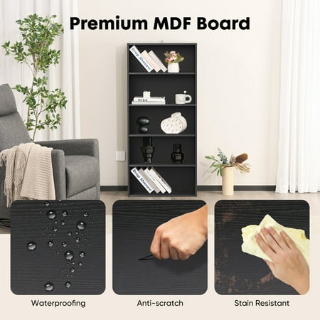 Ample Storage Space: The 5-tier wooden bookcase provides plenty of space for storing books, magazines, decorative items, and other belongings, helping you keep your living space organized and clutter-free.