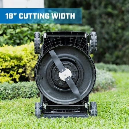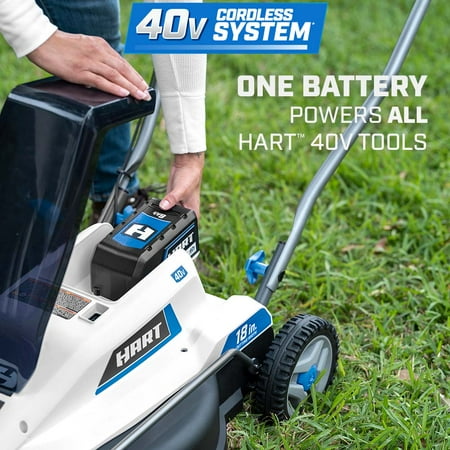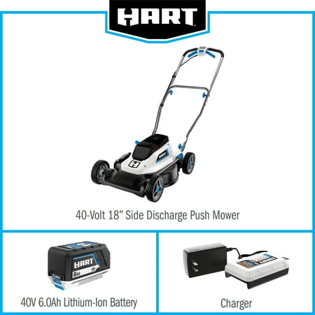 Tired of grass getting stuck under the deck of your mower? Also tired of cleaning blades? If so, then you should consider this electric 40V 18” Side Discharge Mower. It features a side-discharge chute that evenly disperses grass clippings onto the lawn. (Which, by the way, is great for your lawn.) Our lightweight, cordless unit also mulches too. The addition of a single point height adjust makes it easy to tackle mowing of various grass heights from 1-1/2""-4"". Also goodbye to annoying pull cords. This battery-powered machine starts with just the push of a button—and cuts up to 1/4 of an acre on one charge. Works with All HART 40V Batteries. Includes: 40V 18” Side Discharge Mower, 6.0Ah battery, charger, side-discharge chute, start key, mulch plug and operator’s manuals.