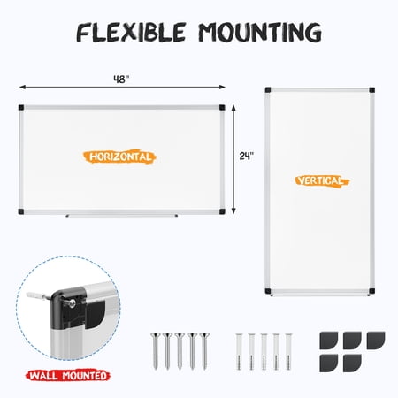 This Magnetic Dry Erase Board is the ideal tool for organizing, brainstorming, and communicating in any home, office, or school setting. With a generous size of 48 x 24 inches, there is plenty of space to jot down reminders, notes, and ideas. The sliver reinforced aluminum frame adds a sleek and professional touch to any space. This whiteboard comes equipped with 1 dry eraser, 2 dry erase markers, and 4 magnetic pins. Stay organized and on top of your tasks with this versatile and stylish Magnetic Dry Erase Board.