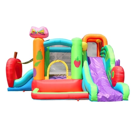 Bring the magic of Eric Carle's classic story to life with the Backyard Kids The Very Hungry Caterpillar™ Bounce House and Slide Combo. This officially licensed inflatable captures the spirit of The Very Hungry Caterpillar™ with colorful artwork, playful fruit details, and a cheerful caterpillar theme that inspires imagination and movement. Perfect for younger children, this inflatable combo features a large bounce area, dual slides, and a mini ball pit for endless ways to play. Measuring 11.8 feet long, 9.8 feet wide, and 6.9 feet high, it offers plenty of room for up to four kids ages 3-10, each weighing up to 75 pounds (300 pounds total). The bounce zone measures 4.7 feet by 4.2 feet, and the slide has a seated height of 3.8 feet;perfect for safe, supervised fun. Built to last, this bounce house is constructed from 840D heavy-duty nylon for the jumping and sliding areas and 420D fabric for the sidewalls and inflation tubes. The finger-safe mesh netting provides full visibility for parents and excellent airflow inside the unit. Water-resistant, flame-resistant, lead-free, and phthalate-free materials make this inflatable safe for both indoor and outdoor play. Setup takes just minutes with the included 750-watt blower. Once inflated, the bouncer stays firm and secure using the provided ground and blower stakes. When the fun is done, the lightweight 40-pound design makes it easy to deflate, fold, and store. Each set includes everything you need right out of the box - blowers, stakes, repair patches, 30 colorful plastic balls for the ball pit, a storage bag, and a detailed instruction manual. The Backyard Kids The Very Hungry Caterpillar™ Bounce House and Slide Combo is perfect for birthday parties, playdates, or everyday backyard fun. Designed for hours of active, screen-free entertainment, it turns any space into a storybook adventure. The inflatable includes a 90-day limited warranty, while the blower is covered by a 1-year limited warranty. Brand: Pogo Bounce House Product Line: Backyard Kids Official Licensed Product: The Very Hungry Caterpillar™