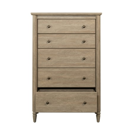 Introducing My Texas House Monroe collection, a blend of elegance and functionality inspired by Erin Vogelpohl's signature style. This rustic bedroom chest combines Erin's love for chic, budget-friendly decor with practical features designed for everyday living. Crafted with the natural wood tones of Brushed Oak® finish, this 5-drawer chest features five spacious drawers equipped with metal runners and safety stops, ensuring smooth operation and longevity. The lower three drawers of this transitional-style chest of drawers are extra deep, providing ample storage space for larger items. This rustic dresser comes with pre-assembled moldings on the end panels and pre-attached drawer slides on uprights and drawer parts to make the assembly process streamlined and hassle-free. An interlocking safety mechanism allows only one drawer to open at a time, enhancing safety and stability. Additionally, this farmhouse-style dresser includes a tip restraint safety strap, adding an extra layer of security. Bring home this collection of farmhouse-inspired bedroom furniture that embodies the essence of affordable and stylish home décor.