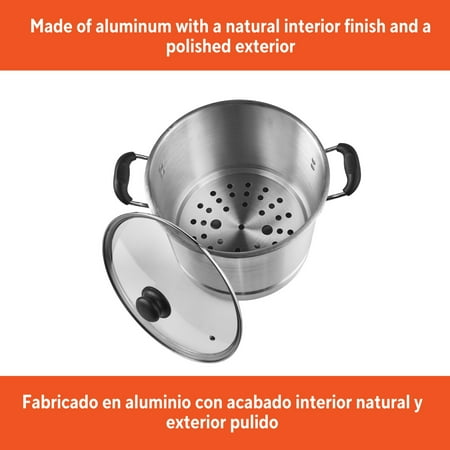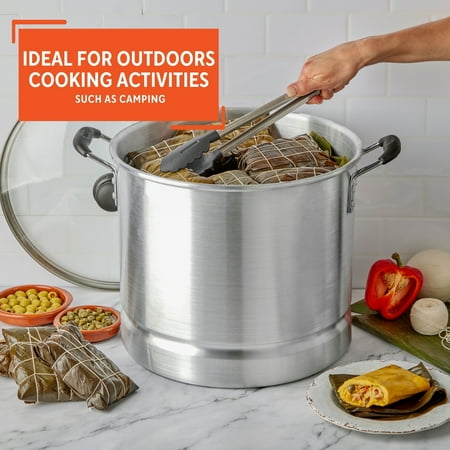 The IMUSA 16Qt Aluminum Steamer is an essential piece in every kitchen. This steamer is made of aluminum with a natural interior finish and polished exterior. This IMUSA cookware piece has a capacity of 20Qt. The IMUSA Aluminum Steamer includes a glass lid that keeps the heat and moisture within for perfectly cooked meals, and a removable steamer insert that adds versatility to your culinary endeavors. You can control your cooking without losing steam thanks to the convenient glass lid. Its Bakelite side handles provide a comfortable grip making it convenient to transport from the kitchen to the table. With this versatile piece, you can cook a variety of different meals. Whether preparing tamales, vegetables, or seafood, the IMUSA Aluminum Steamer excels. Use it without the insert for cooking pasta, noodles, potatoes, and more. Its adaptability extends beyond the kitchen, as it seamlessly transitions to outdoor cooking. Trust the IMUSA Aluminum Steamer for balanced, home-cooked meals. It will surely become your kitchen's beloved companion, uniting tradition, and innovation in every delectable creation and elevating your culinary experience.