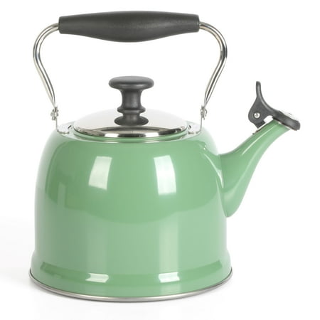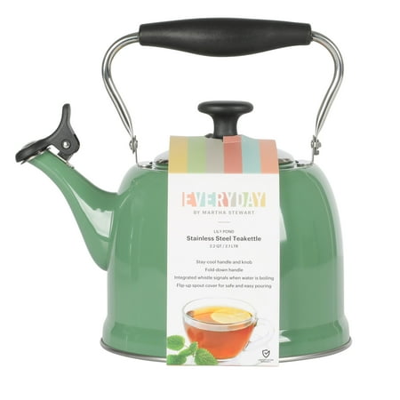 Keep hot water ready and within reach when cooking. The Everyday by Martha Stewart Lily Pond 2.2-quart Whistling Tea Kettle prepares hot water as needed for soups and stocks or coffee and tea. Made from stainless steel, the tea kettle offers everyday durability and quick heat distribution to serve hot water on time. The glossy enamel finish elevates this classic kitchen essential as a statement stovetop centerpiece that looks good in any kitchen. The flip-up spout emits a soft whistle when the water has come to a rolling boil and is ready to serve. For easy and safe pouring, the sturdy handle provides a comfortable grip. To clean the interior, fold down the handle to reach the trickiest corners of the tea kettle. Safe to use on all stovetops, this whistling tea kettle will signal the start of midday coffee breaks or quiet tea times in the most stylish fashion. Hand wash only. Enjoy beautifully crafted kitchen and tabletop pieces that blend style and function with Everyday by Martha Stewart. Inspired by Martha's love for elevated dining and entertaining, these products are crafted for the everyday home cook who shares her passion for home-cooked meals, entertaining guests, and sharing moments with family and friends.