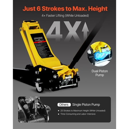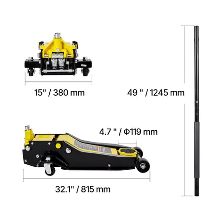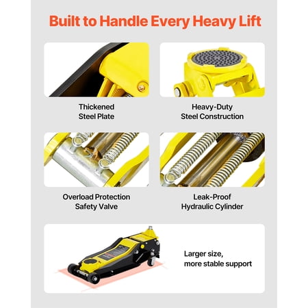 Product Description Hydraulic Floor Jack, Reliable Performance for Every Lift This durable iron floor jack is designed to handle heavy loads, making it suitable for lifting sedans, SUVs, and trucks. Its extended lifting range ensures easier access for vehicle maintenance, tire replacements, and cleaning tasks. Reminder: Always use a jack stand for prolonged repair work. Reinforced Steel Construction This compact floor jack is constructed using reinforced steel, ensuring durability and resistance to wear over time. Pressure Release Mechanism This hydraulic floor jack is equipped with an integrated overload protection system, designed to prevent usage beyond its specified capacity, ensuring safety and durability over time. Hydraulic Pump The durable, sealed hydraulic pump is designed to reduce oil leakage, ensuring dependable and secure operation when using the floor jack. Robust Weight-Bearing Capability This durable steel jack is designed to lift SUVs, pickups, and other heavy vehicles effortlessly. It’s a practical choice for both professional mechanics and car enthusiasts tackling projects at home. Extensive Height Adjustment Range Crafted to handle vehicles with higher ground clearance, this low-profile jack is suitable for a broader range of cars. Ensure you check your vehicle's ground clearance prior to purchase. Two-Piston Hydraulic System For frequent use with a steel floor jack, the dual-piston mechanism ensures quicker lifting of heavy loads, saving time and effort. The integrated safety system and sealed hydraulic cylinder enhance stability and reduce the chance of tilting during operation. Specifications Item Model Number: WD-B-04250-B00-0 Net Weight: 102.5 lbs/46.5 kg (including all accessories) Product Dimensions: 32.1 x 15 x 7.9 in/815 x 380 x 200 mm Package Content 1 x Floor Jack