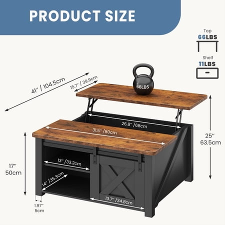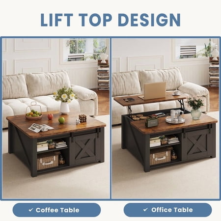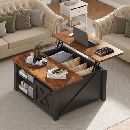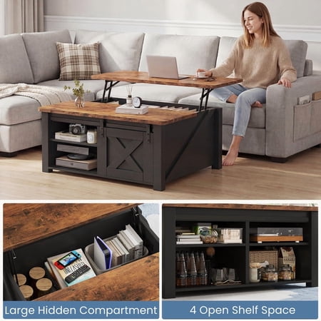 This lift-top coffee table features a smooth, spring-assisted lifting mechanism that reveals a spacious hidden compartment with adjustable shelves—perfect for storing blankets, books, remotes, or office supplies. Its sturdy construction and modern design make it ideal for living rooms or small home offices, offering both functional workspace and clever concealed storage in one stylish piece.