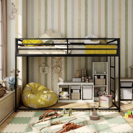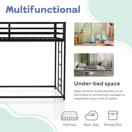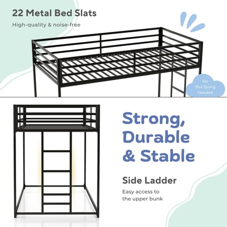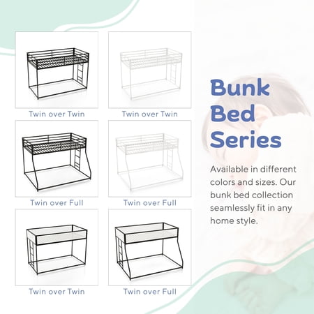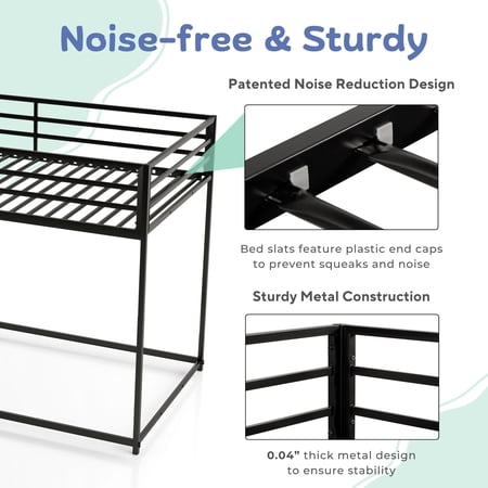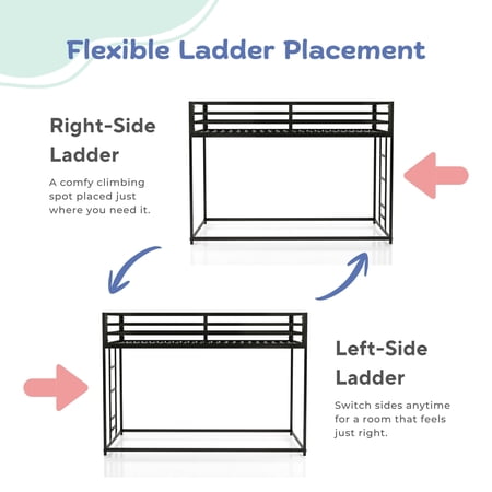 Maximize space and functionality with this sleek industrial-style twin over twin bunk bed. Designed with a sturdy metal frame and patented noise-reduction slats, it ensures a quiet and stable sleep. Full-length guardrails enhance safety, while a reversible ladder and under-bed space offer versatile storage or sleeping options.