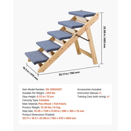 Product Description Assists Pets in Climbing Comfortably This set of pet stairs with a 5-step design is ideal for pets of various sizes, particularly older, recovering, or less mobile animals, to safely access beds and sofas. The durable construction ensures reliable support, while the foldable design allows for convenient storage and portability, making it a space-saving solution when not in use. 5-Tier Pet Steps This 5-step pet staircase is designed with a wide and stable structure, providing a secure way for pets with mobility challenges to access couches, beds, and other elevated resting areas. Durable and Reliable Sturdy pine wood panels paired with large screws ensure reliable stability, minimizing shaking and allowing pets to climb securely. Soft and secure surface designed to provide comfort and prevent slipping. These pet stairs for beds feature steps covered in fabric, providing improved traction for paws and a cushioned surface to reduce the risk of slipping or injury for your furry friends. Designed to fold conveniently, allowing for compact storage and effortless portability. These portable and lightweight pet stairs are designed to fold easily, allowing for compact storage and effortless transportation, making them ideal for saving space at home or during travel. Versatile Usage This collapsible pet staircase is perfect for small to medium-sized dogs, older pets, or those recovering from injuries who require assistance reaching elevated furniture. Simple to Put Together The installation process is simplified with the use of bolts and screws, allowing for quick and easy assembly without consuming much time or effort. Specifications Item Model Number: ZD-25DOG07 Suitable Pet Weight: ≤150 lbs Step Height: 4.72 in / 12 cm Carrying Type: Foldable Main Material: Pine Wood + Felt Fabric Product Weight: 13.45 lbs / 6.1 kg Step Size: 15.35 x 7.09 x 0.59 in / 390 x 180 x 15 mm Product Dimensions: 30.71 x 18.5 x 25.98 in / 780 × 470 × 660 mm Package Content Instruction Manual ×1 Training Card (with string) ×1