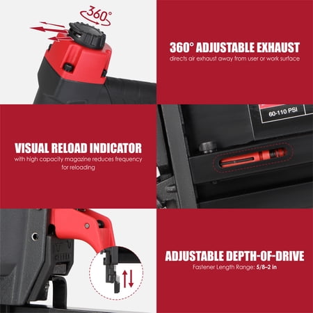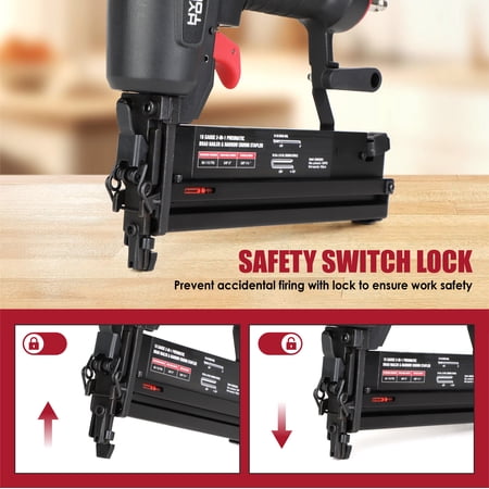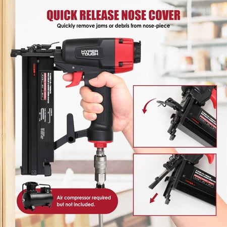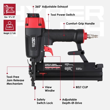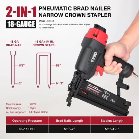 Hyper Tough 18 gauge 2-in-1 pneumatic brad nailer and narrow crown stapler combines two functions in one tool, making it ideal for woodworking, home renovation, and DIY projects. It features a 360° adjustable exhaust port, comfortable grip, non-marring pad, and a tool-free jam clearing mechanism for safer and more convenient operation. Suitable for air pressure ranges of 60–110 PSI and shoot 18-gauge 1/4-inch crown staples ranging from 5/8 to 1-1/2 inches in length or 18-gauge brads ranging from 5/8 to 2 inches long, it's an ideal choice for both DIY enthusiasts and professional craftsmen.