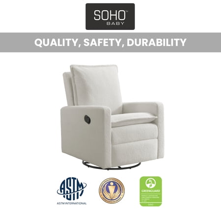 Create a warm and welcoming nursery with the Soho Baby Coventry Swivel Glider & Recliner. With its sleek, modern design and premium boucle fabric, Soho Baby Coventry Swivel Glider & Recliner boasts luxury and comfort for ultimate relaxation and quality time with your baby. The Coventry Glider & Recliner features quiet metal mechanisms that offer a full range of motion , a calming rocking motion and a gentle 360-degree swivel. Designed for comfort, the Coventry Swivel Glider & Recliner is comfortably cushioned throughout to ensure lifelong comfort and includes a recline option. This comfort addition is perfect for soothing both parents and baby and stylish enough to be transitioned to any room at home.